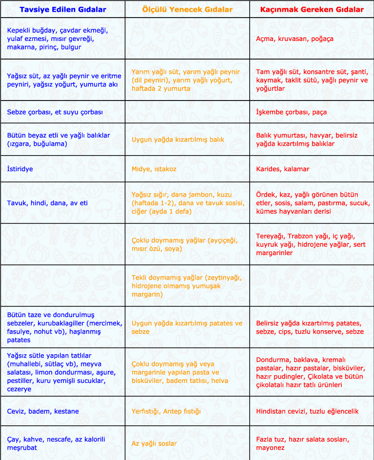 > Tavuk, hindi ve balık eti koyun ve sığır etine tercih edilmeli. Kızartma yerine ızgara, haşlama, buğulama gibi pişirme şekilleri kullanılmalıdır.